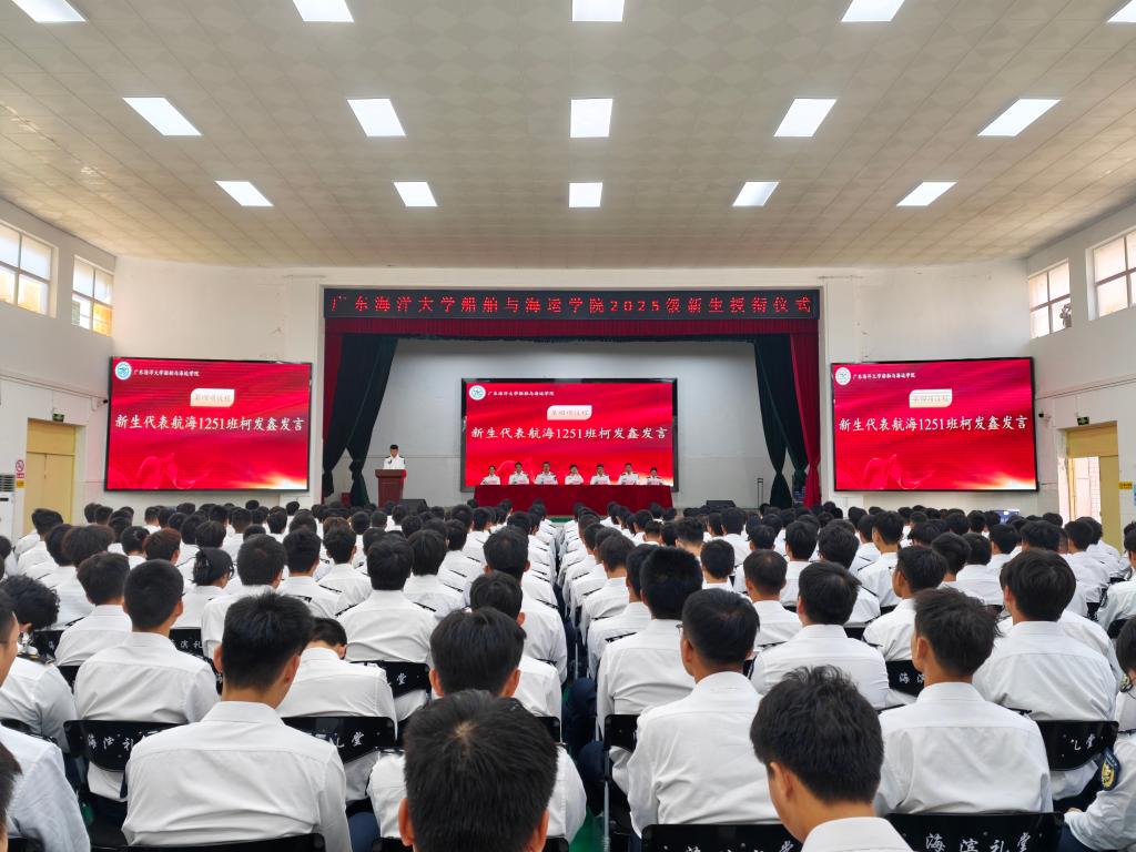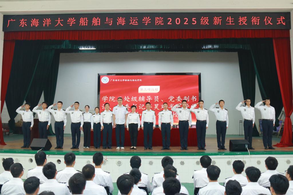 在海滨校区礼堂举行了2025级新生授衔仪式。学院党委书记邓朝晖,正处级辅导员、党委副书记齐昊,轮机系主任安连彤,半军管大队长江涛,副大队长吴捍泽,辅导员黄荔、邓海漫及2025级各中队同学等300余人参加会议,活动由江涛主持。